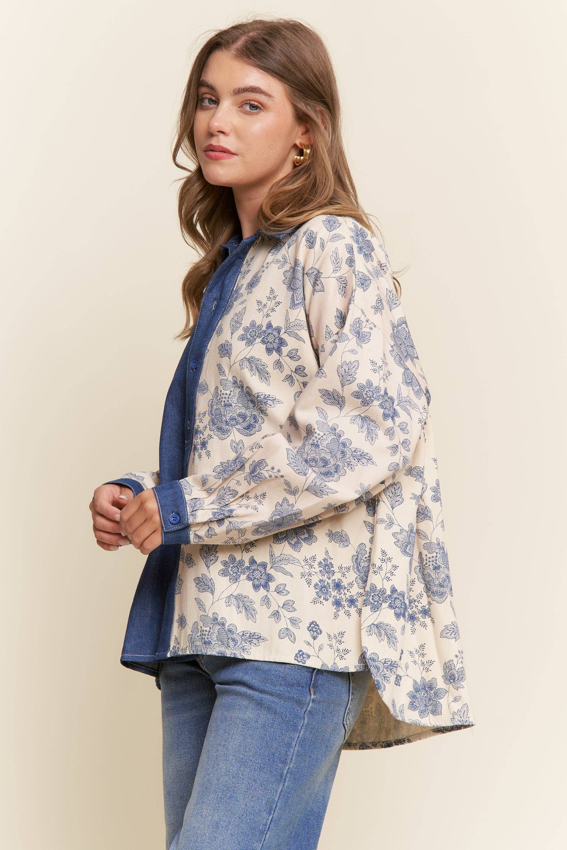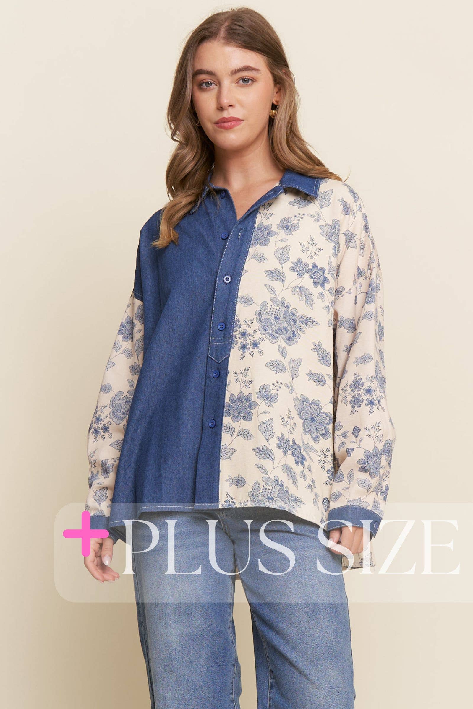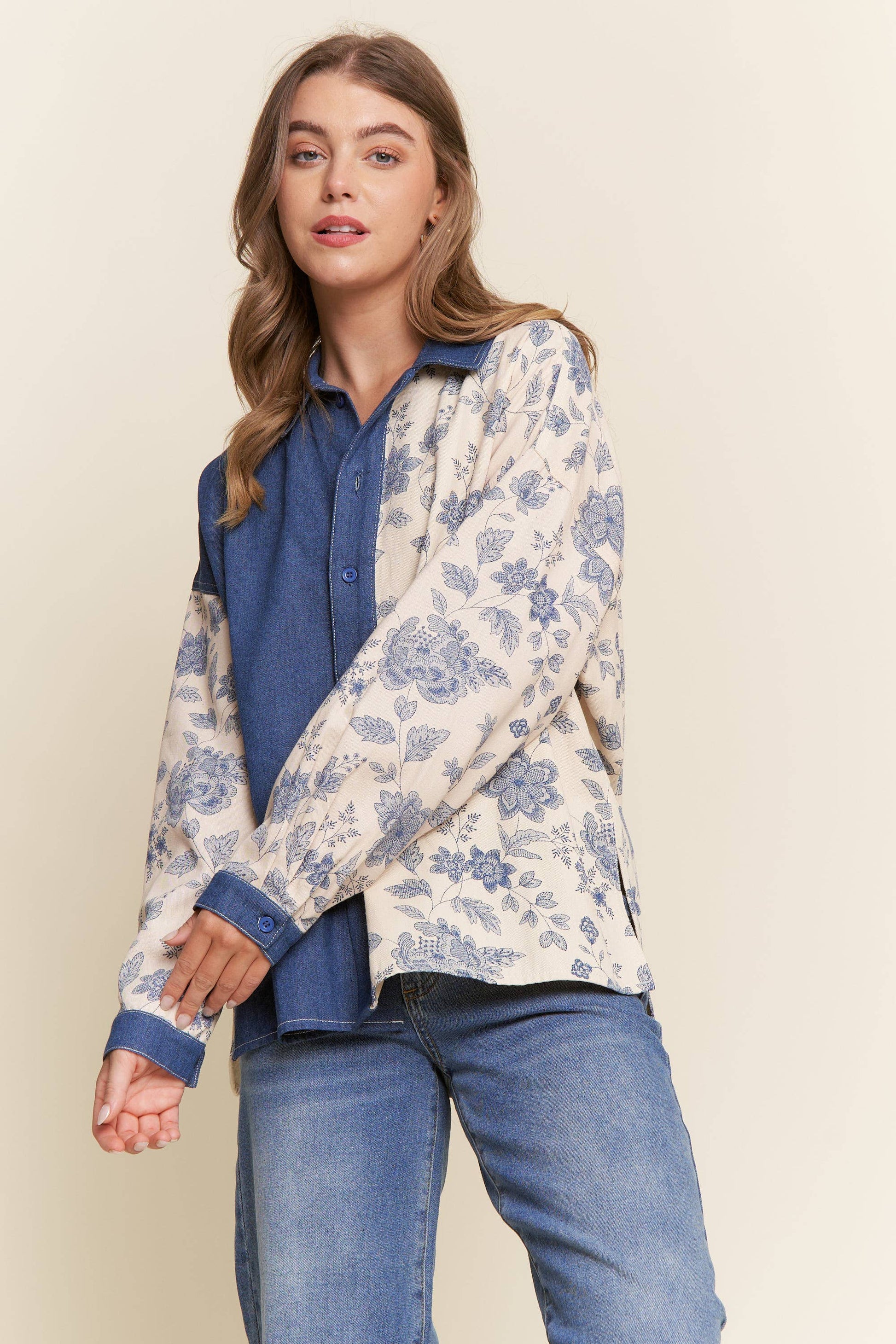Looking for a stylish and versatile addition to your wardrobe? Check out our Denim Floral Print Color Block Button Up Top! This top features a unique combination of floral print and color blocking on soft denim fabric. Upgrade your style with this must-have piece.