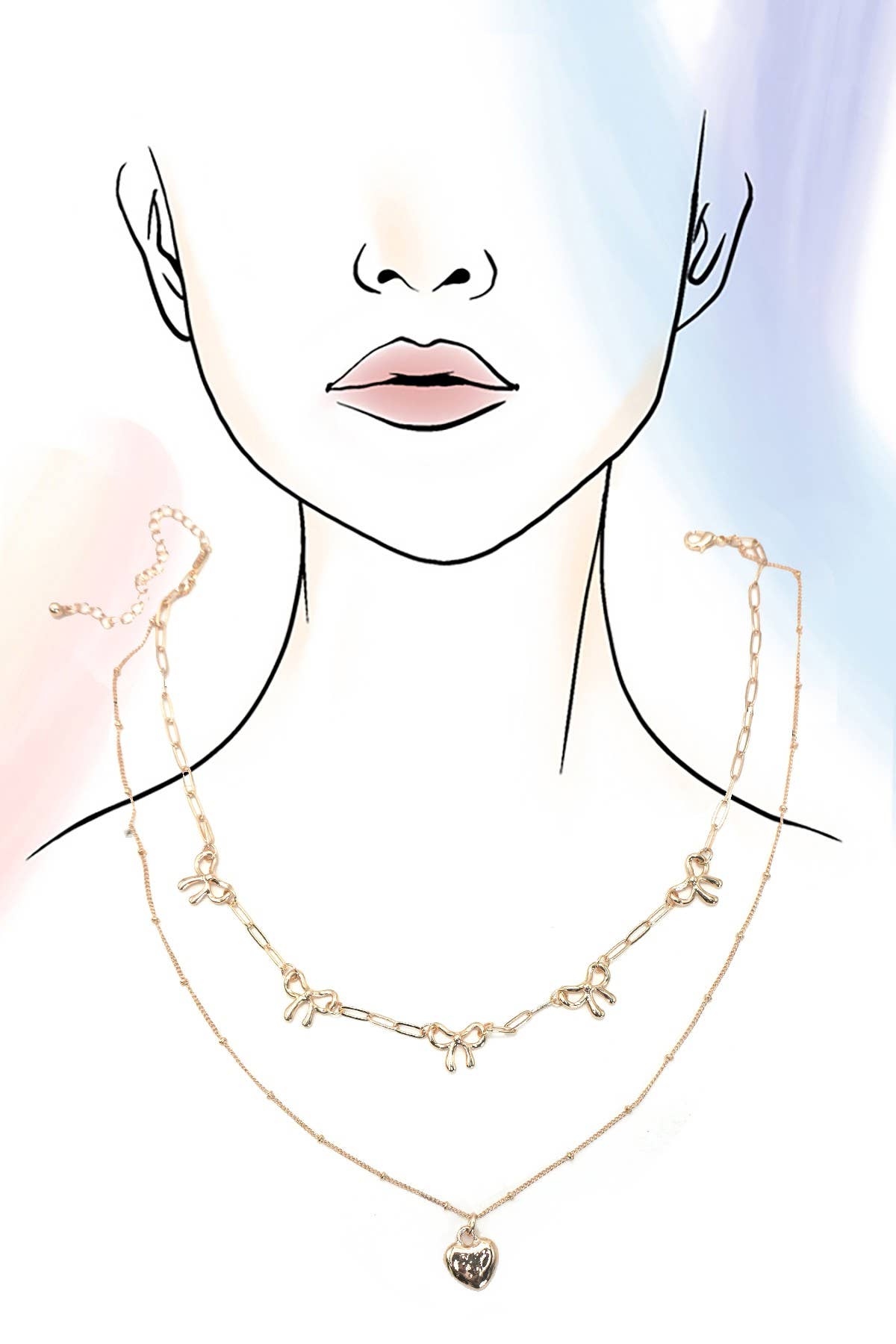 Double Layer Multi Bow with Heart Charm Necklace. Featuring delicate layered chains, this necklace is adorned with multiple dainty bow charms and a sweet heart pendant, creating a romantic and feminine aesthetic. Product Details: length: 16"