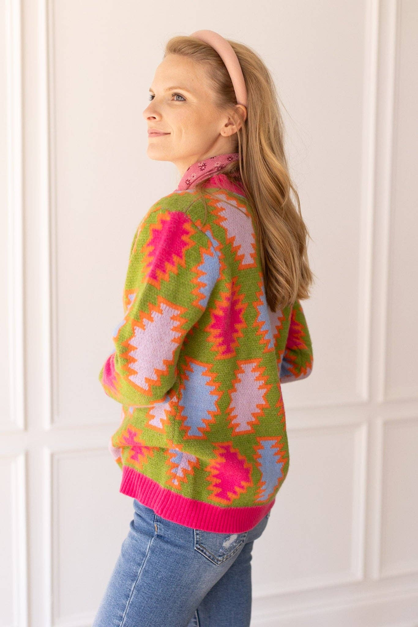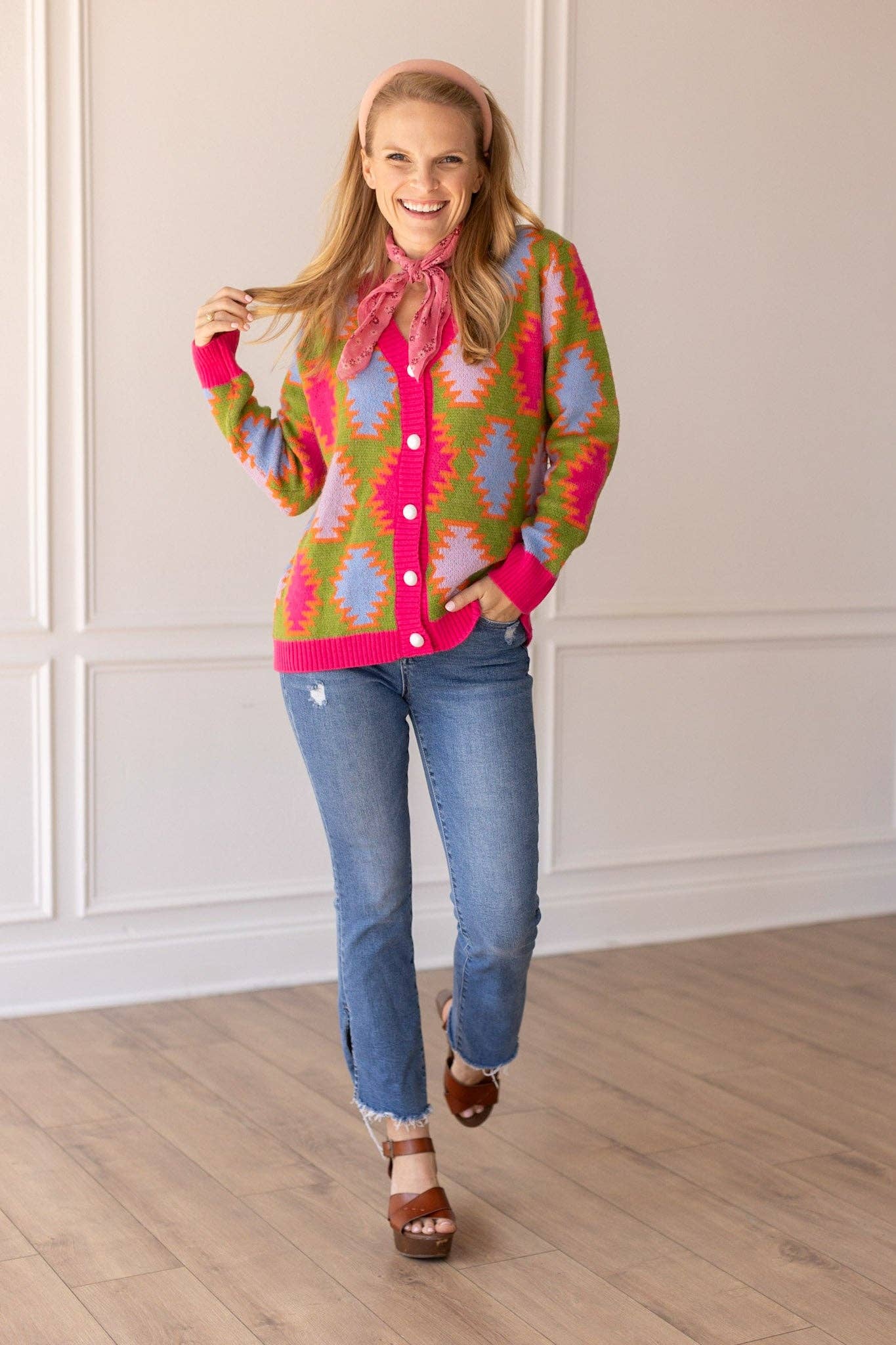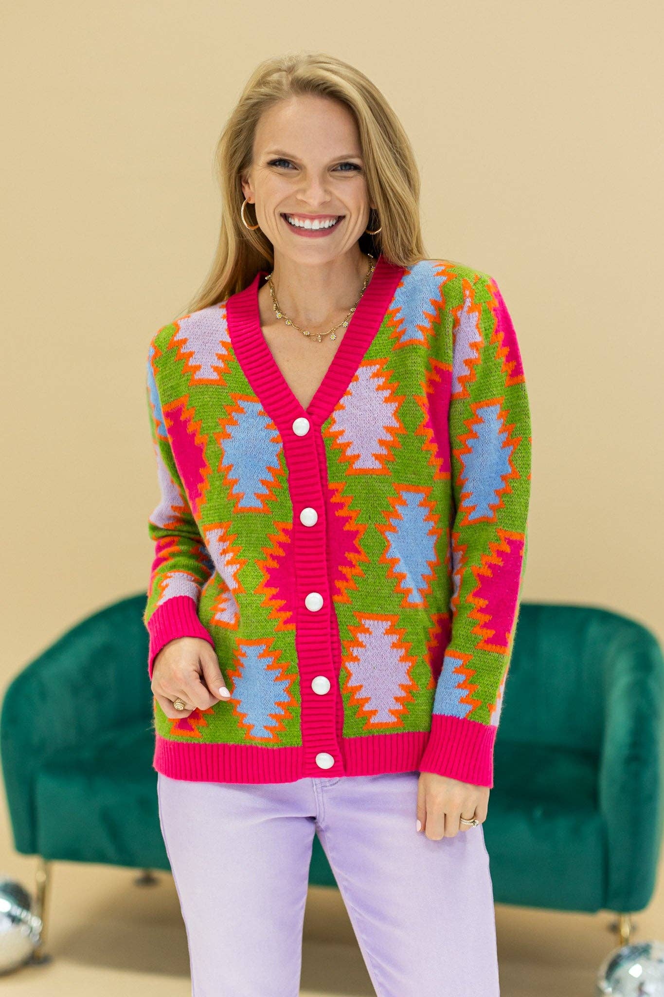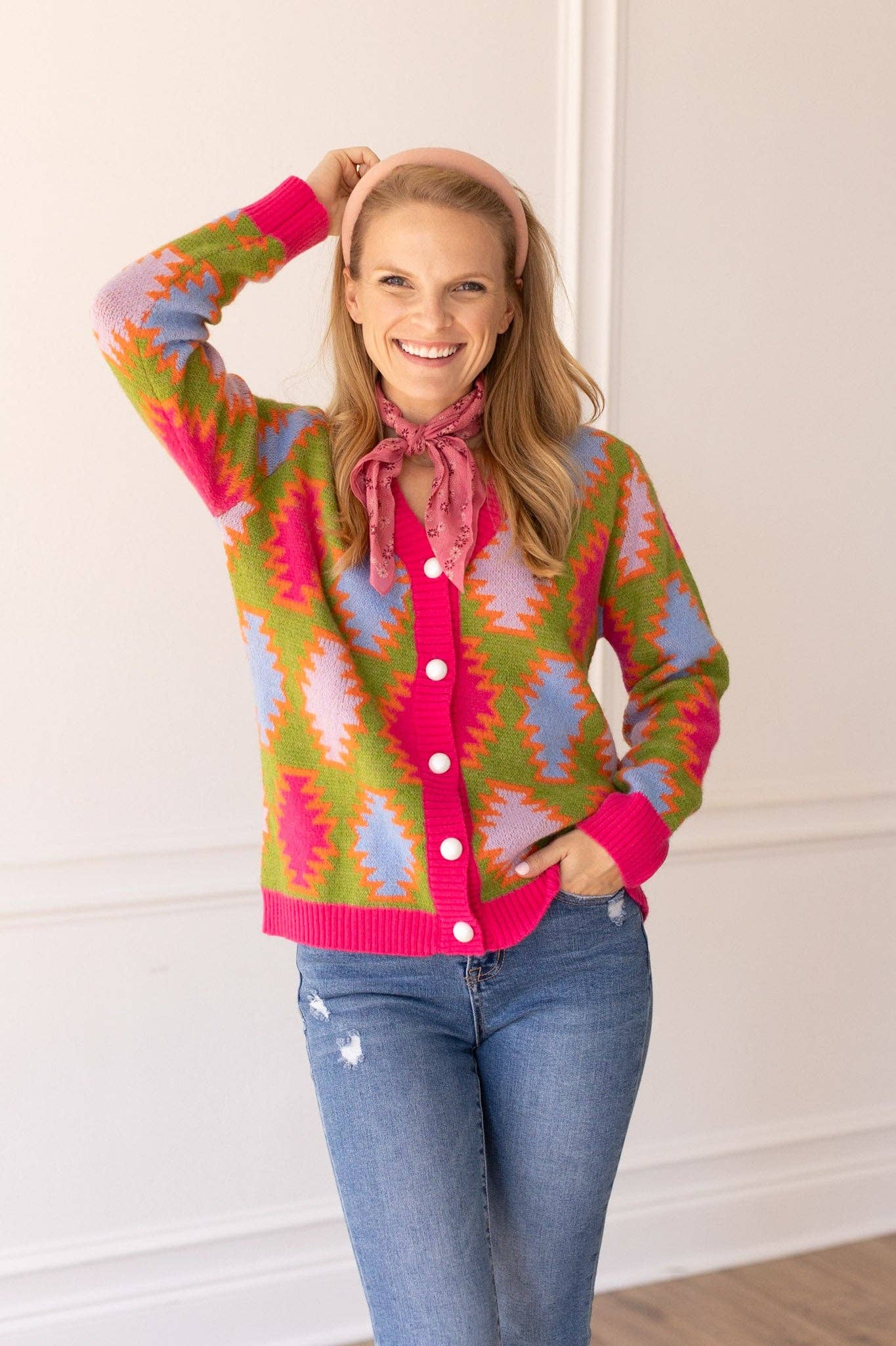 Elevate your wardrobe with our Fiesta Fusion Colorful Aztec Cardigan, a vibrant and trendy addition for a pop of color in any season. The cardigan showcases a playful mix of bold patterns and lively hues, offering a lively and contemporary aesthetic. Perfect for layering, this cardigan effortlessly combines style and comfort for a versatile and eye-catching look.