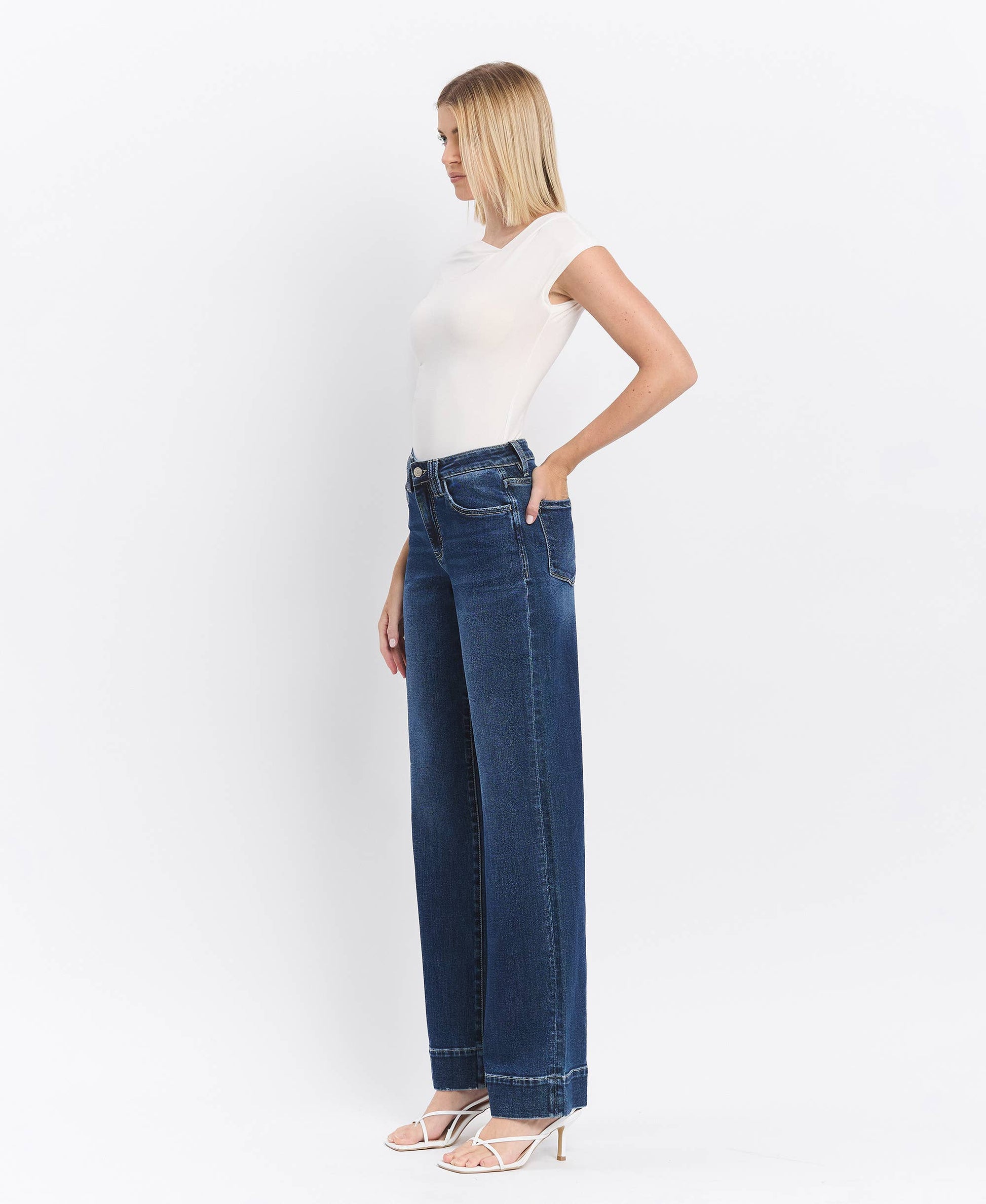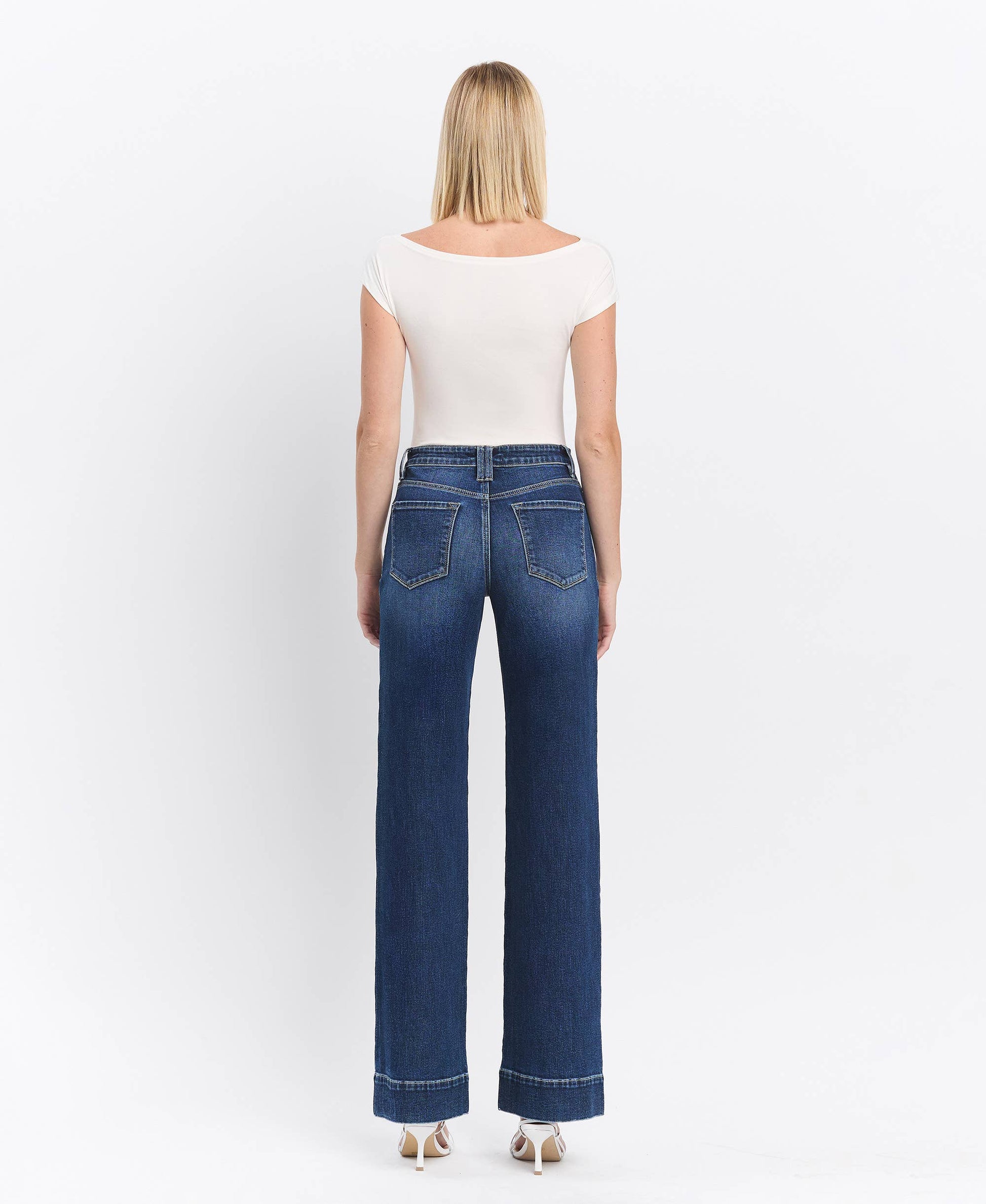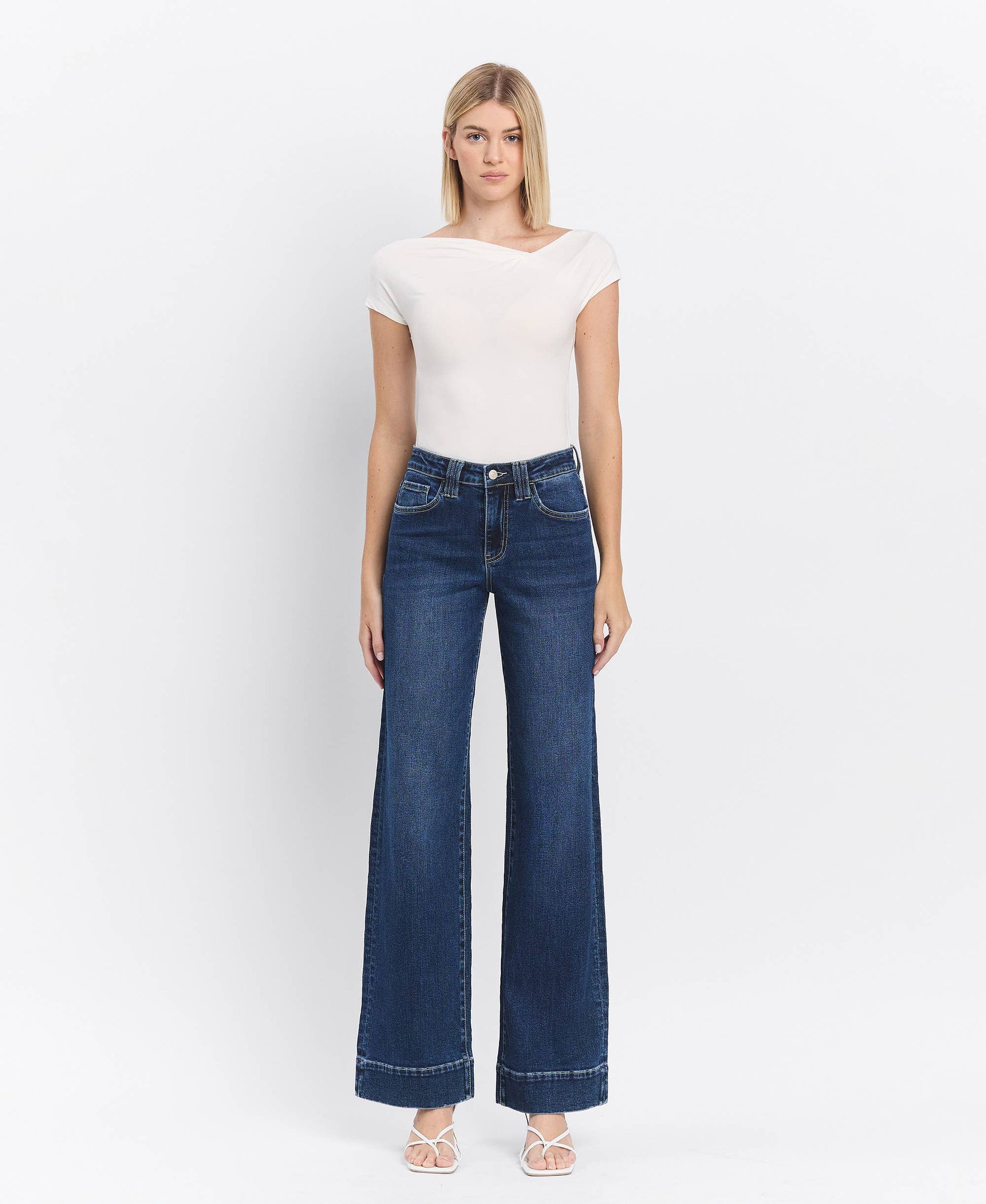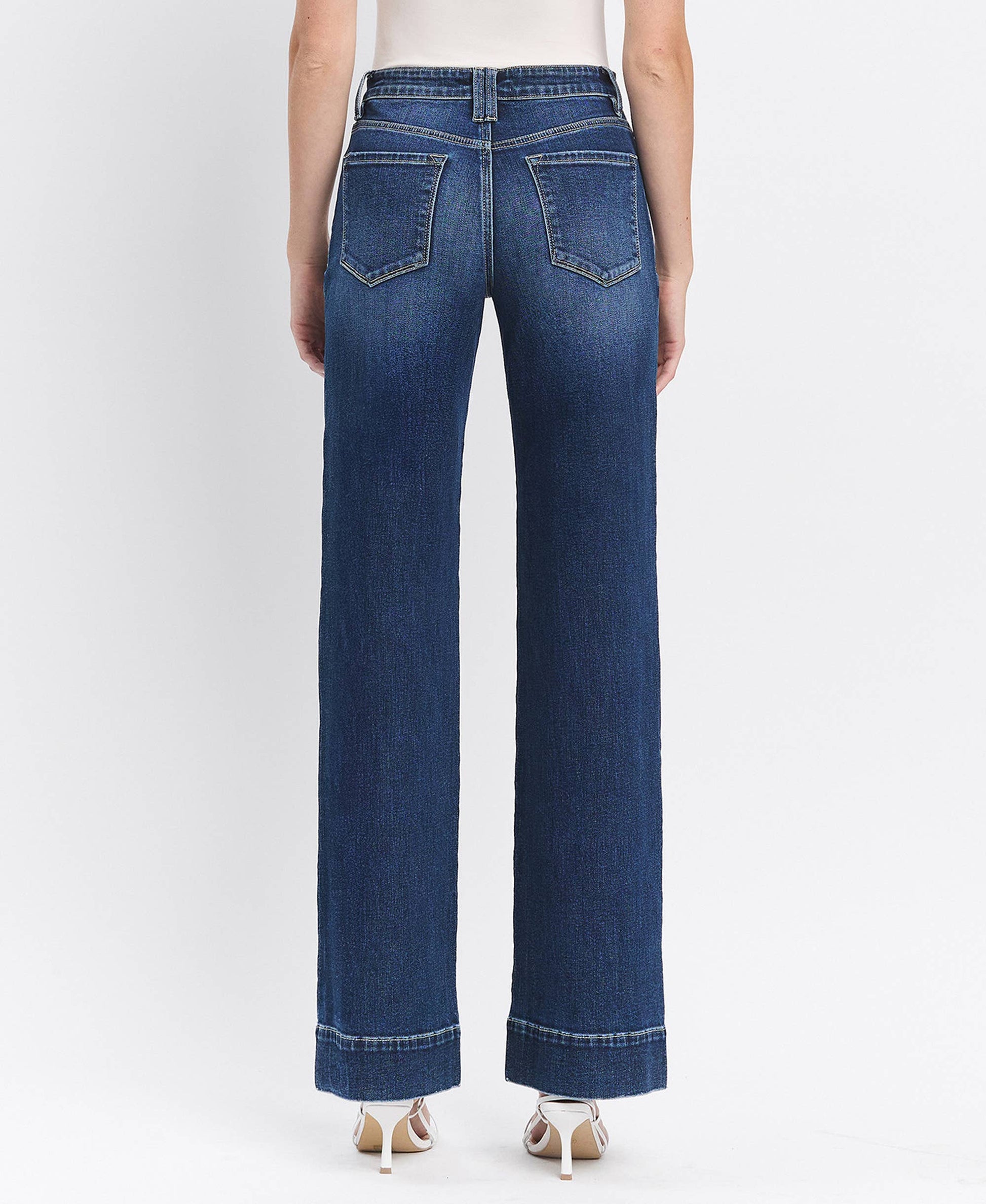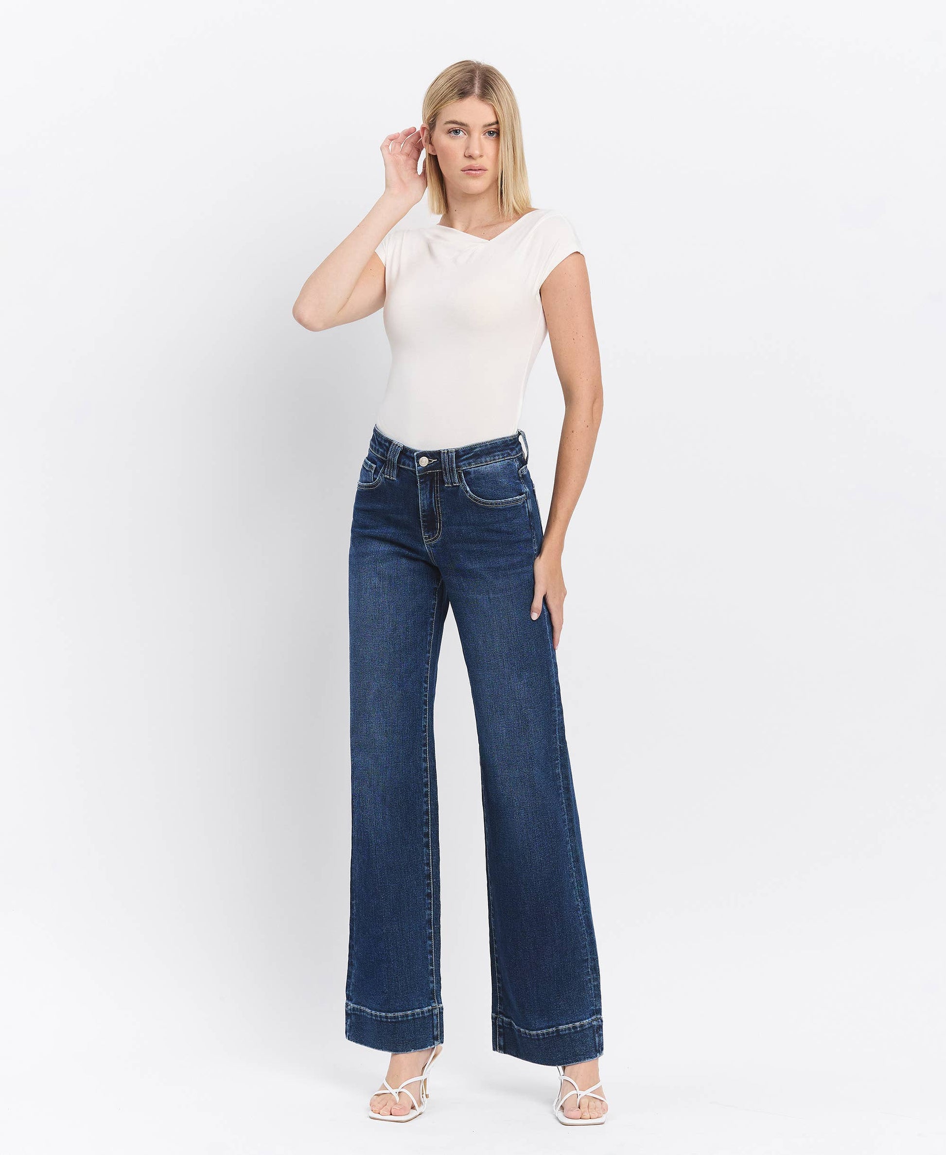 These Vervet High Rise Trouser Jeans are made from dark wash comfort stretch denim, featuring a high rise waist, 5 pockets, and a full length design. The trousers have a wide leg cut, providing a stylish and comfortable fit.