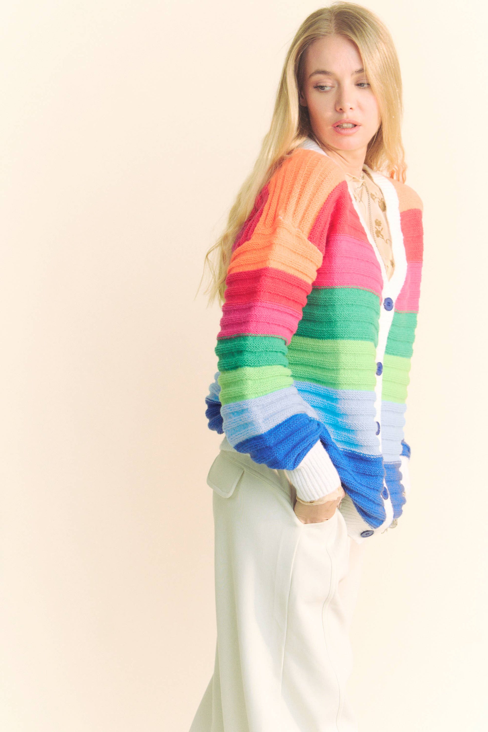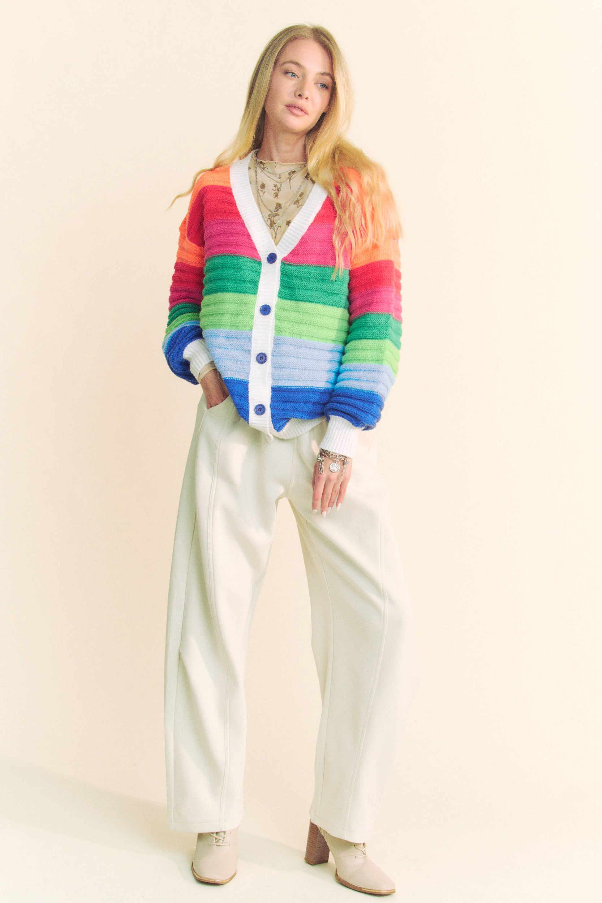 Brighten your boutique collection with this bold rainbow stripe knit cardigan. Featuring vibrant color blocking, a cozy textured knit, and contrast button front, this playful yet elevated layering piece offers cheerful versatility for casual to statement styling. Designed to stand out, it’s a boutique favorite that pairs effortlessly with denim or skirts for year-round wear. 100%POLYESTER